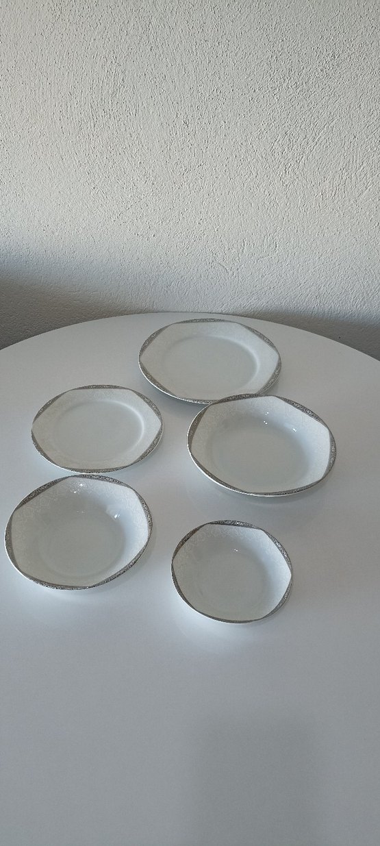 Farklı boyutlarda, gri kenarlı beyaz porselen yemek takımı , 6 adet servislik 6 adet yemek 6 adet çorbalık 6 adet meze 6 adet tatlı tabaği sade ve şık tasarım. ️