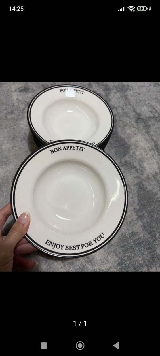 Beyaz seramik tabaklar gri kenarlıklarla, üzerinde 'BON APPETIT' ve 'ENJOY BEST FOR YOU' yazılıdır. ️makarna tabağı olarak geçiyor 2 adet fiyatıdır