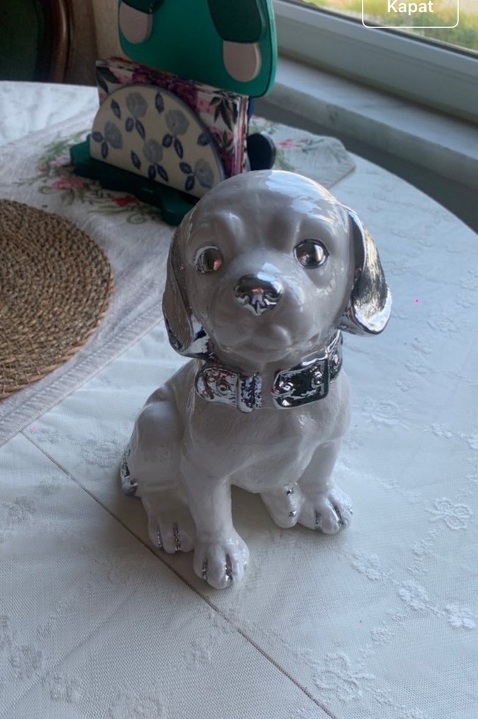 Gri detaylı beyaz köpek figürü, oturur pozisyonda ve detaylı bir tasma ile parlak yüzeye sahip. Parlak yüzeye sahip beyaz ve gri köpek figürü, detaylı gözler ve tasma ile süslenmiş.yaldızlı dokunuşlarla şık kaliteli biblo.boy 21cm,en 10cm