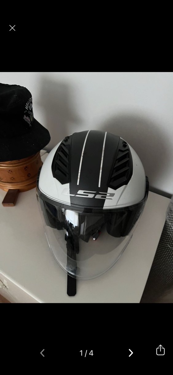 Beyaz ve gri renklerde, baskılı desenli, tokalı bantlı LS2 biker kaskı. Şeffaf vizörlü, metal detaylı, minimal ve rock punk tarzı.