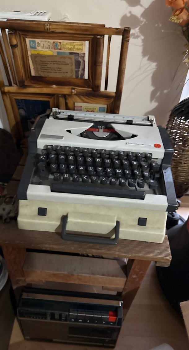 Siyah tuşlu beyaz ve gri mekanik daktilo, kompakt tasarıma ve taşıma sapına sahiptir. ️