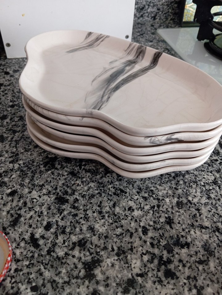 Beyaz tabaklar üzerinde şık gri mermer desenleri bulunan, yumuşak kıvrımlı kenarlara sahip servis tabakları seti. ️