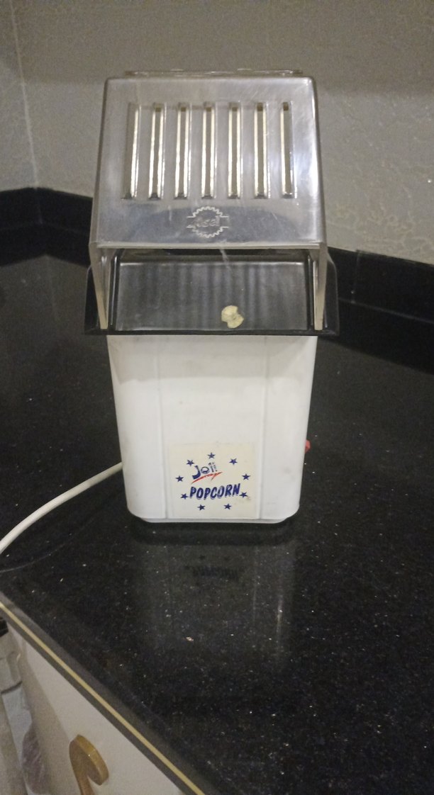 Beyaz ve gri renkte, metal üst kısmı olan klasik tasarımlı mısır patlatma makinesi. Kolay kullanımlı. lezzetli patlamış mısır hazırlamak için çok pratik kullanıma engel olmayan üst kapakkisiminda hasar var ürün temiz çalışıyor