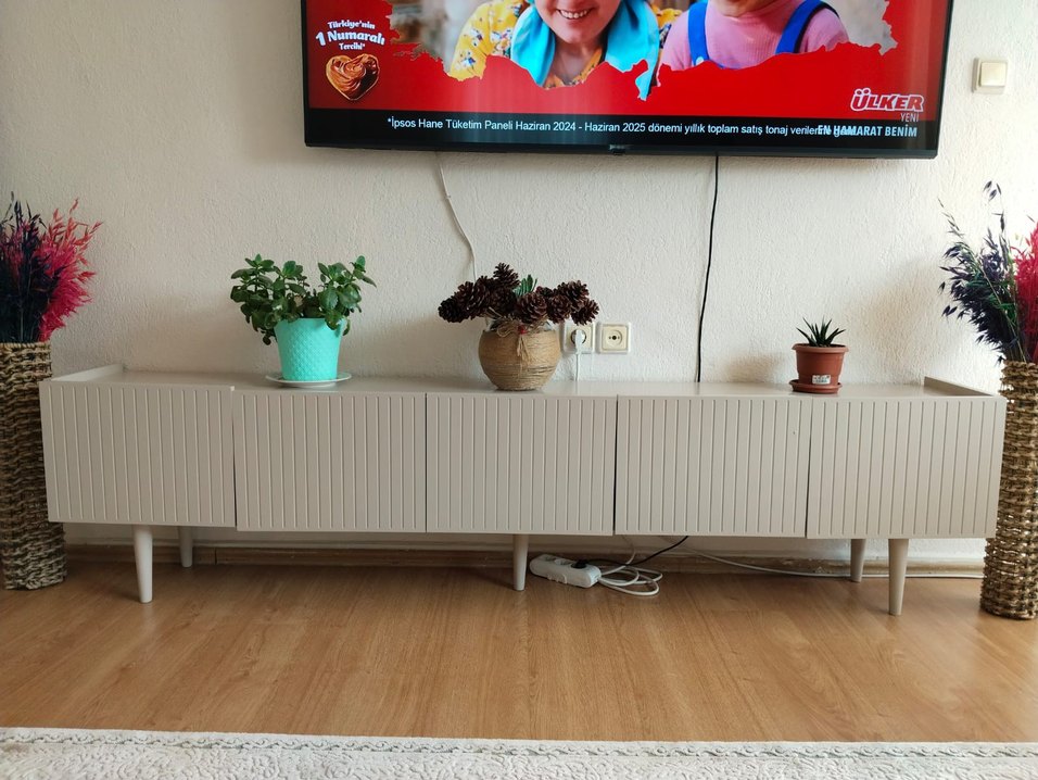 Beyaz ve gri renklerde, modern tasarımlı TV ünitesi. Dikey çizgili yüzeyi ve beş ayaklı yapısıyla şık ve sade bir görünüm sunar. Bir kapağında ufacık bir defosu vardır. MDF malzemedendir tamamı. Sağlam kaliteli bir üründür.