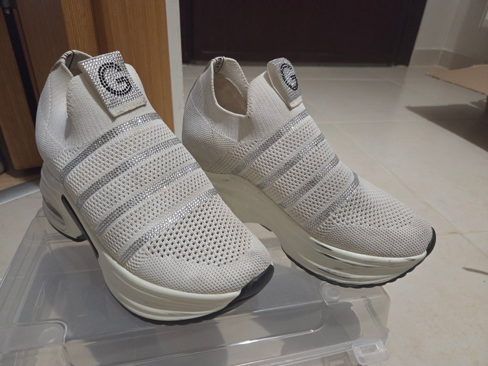 Beyaz ve gri renklerde, nakış detaylı kadın spor ayakkabısı. Elastik yapısı ve dolgu topuklu tabanı ile rahat kullanım sağlar.