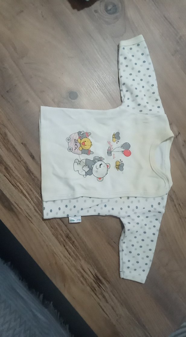 Yumuşak ve sıcak kumaştan yapılmış, kolları gri noktalı ve önünde baskılı desen bulunan beyaz çocuk sweatshirtü.