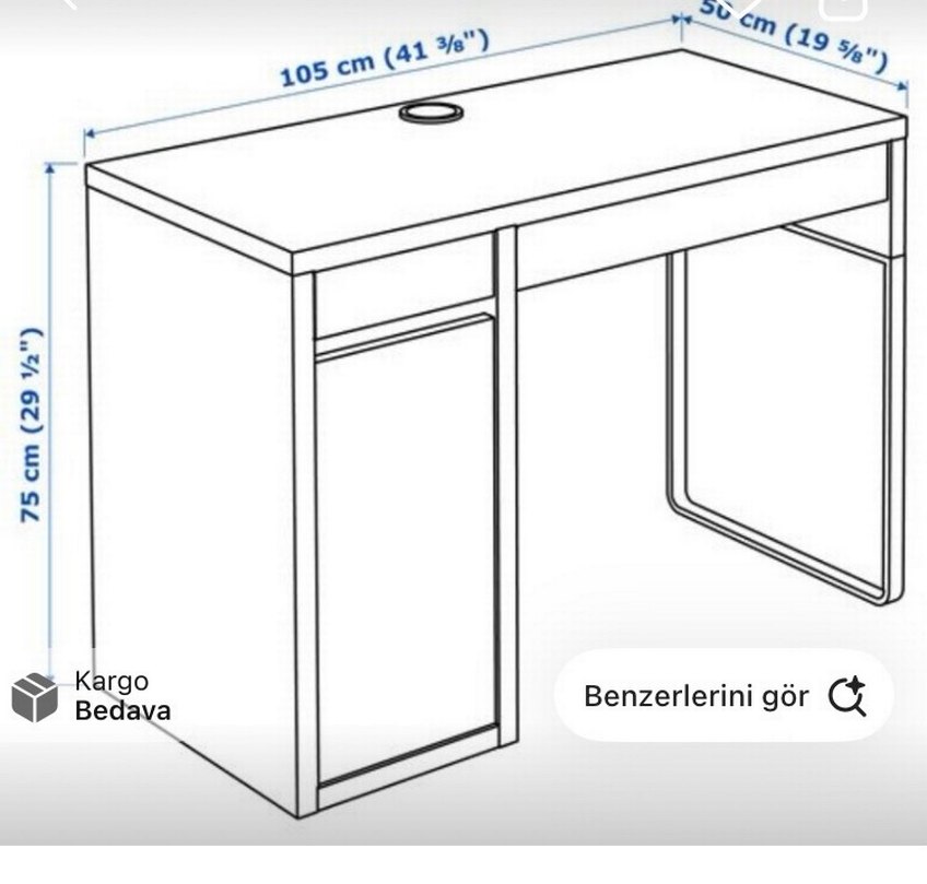 105x50 cm ölçülerinde, kablo deliği bulunan beyaz ve gri ofis masası.