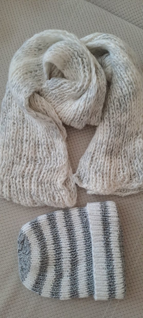 Yumuşacık örülmüş beyaz gri renklerde düz atkı ve çizgili bere seti.