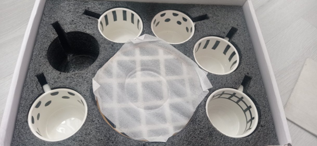 Beyaz ve gri renklerde, puantiyeli ve çizgili desenlere sahip bohem tarzda fincan seti. Sanatsal desenlerle çeşitli fincanlar içerir. ️