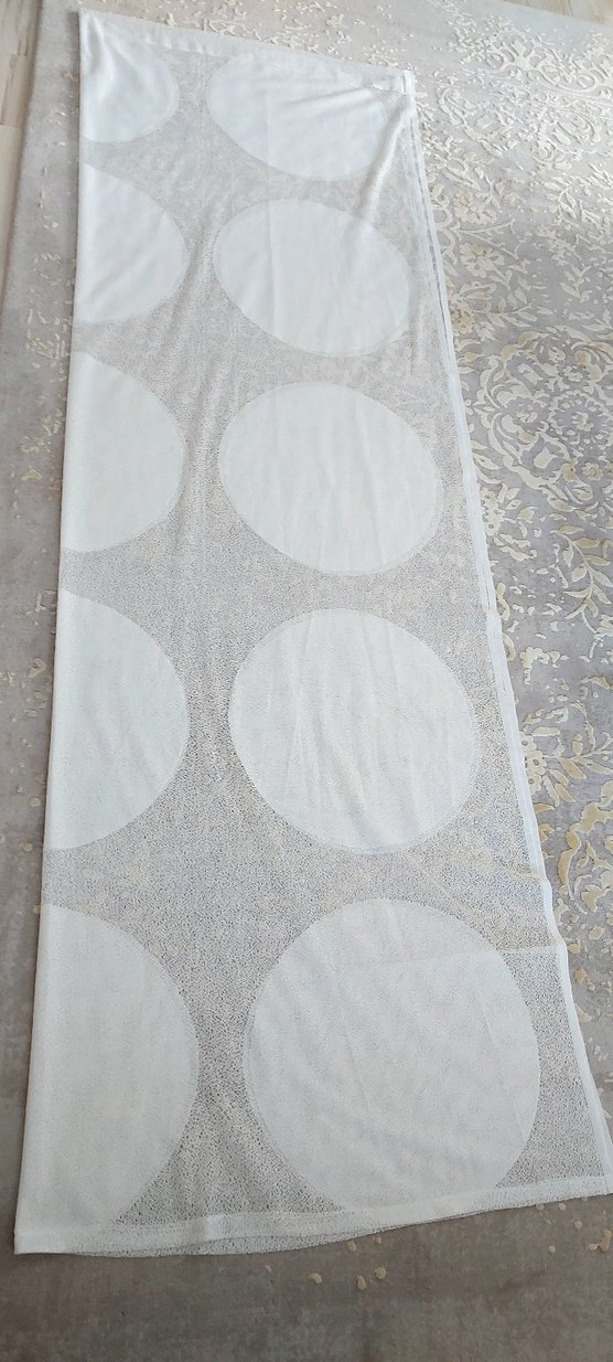 Gri zeminde büyük beyaz puantiyeler bulunan modern tarzda masa örtüsü, sofranıza şık ve yumuşak bir dokunuş katar.150 x 225 cm. İki adettir. ️