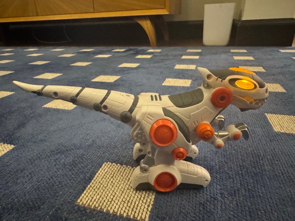 Pilleri az durumda . Yeni pil alırken yardımcı olması için pilleri ile gönderilecektir . Kumandalı , düz gidiyor ve dönüyor . Beyaz ve gri renkte, turuncu detaylara sahip robot dinozor figürü. Hareketli parçaları bulunur.