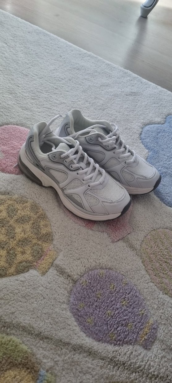 Beyaz ve gri renklerde, lastik tabanlı ve stilettolu topuklu kadın spor ayakkabısı. Sokak modasına uygun, zahmetsiz şıklık sunar. Spor için ideal.