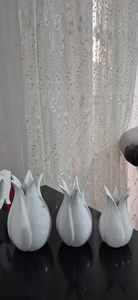 Gri tonlarında beyaz seramikten yapılmış, lale tomurcuğu şeklinde üçlü vazo seti. Parlak ve pürüzsüz yüzeye sahiptir.