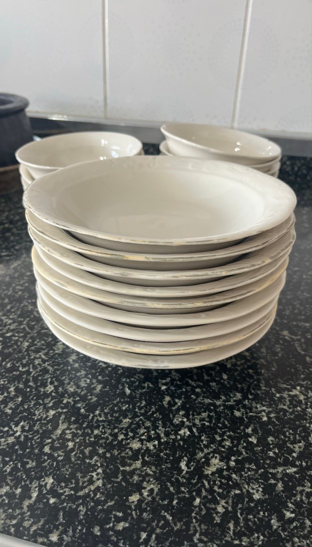Beyaz ve gri tonlarında, üst üste dizilmiş yemek tabakları seti. Tek set fiyatıdır