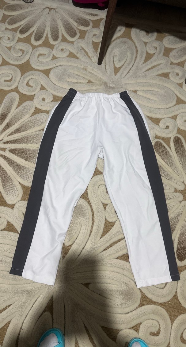 Beyaz renkte, gri yan şerit detaylı, rahat kesim pantolonu. Yumuşak sentetik kumaştan üretilmiş, zahmetsiz şıklık sunar.