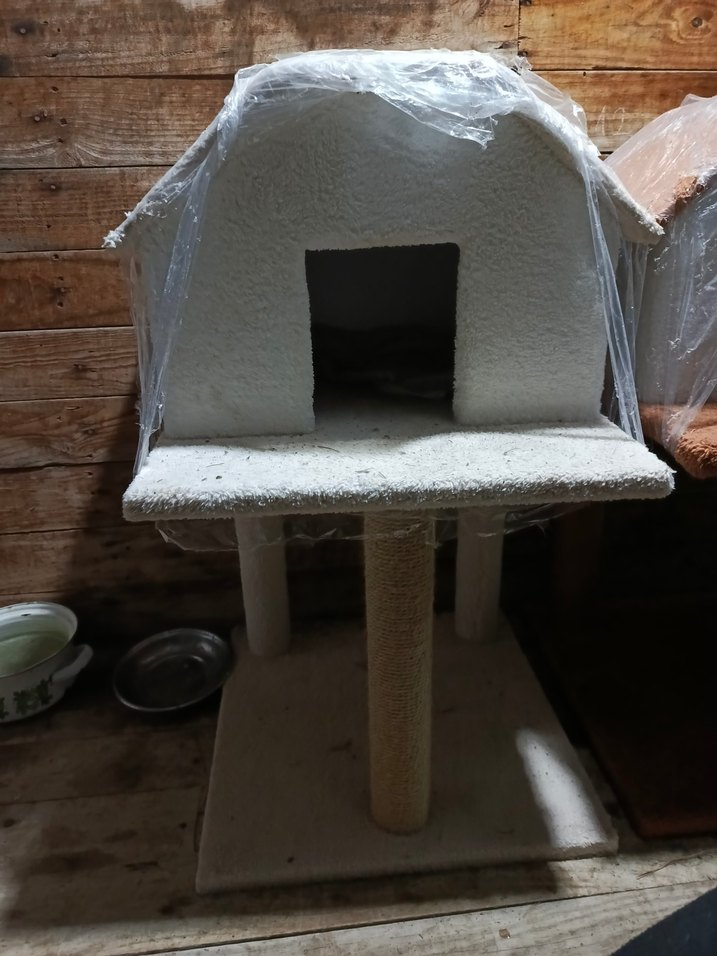 Yumuşak malzemeden yapılmış beyaz gri yeşil kahve kedi evi ve tırmalama direği, kediler için rahat bir alan sağlar. 4 adet var elimde. hepsini alana indirim yapılır adet fiyatıdır. üst jelatinler sökmedim bile cok az kullanıldı. çiftlik için almıştık biraz yabani kedi oldukları için beğenmediler sanırım. ev kedileri için uygun.