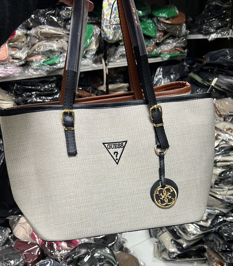Sentetik kumaştan beyaz kadın omuz çantası, GUESS baskılı ve tokalı askılı. Sokak tarzı için uygun.