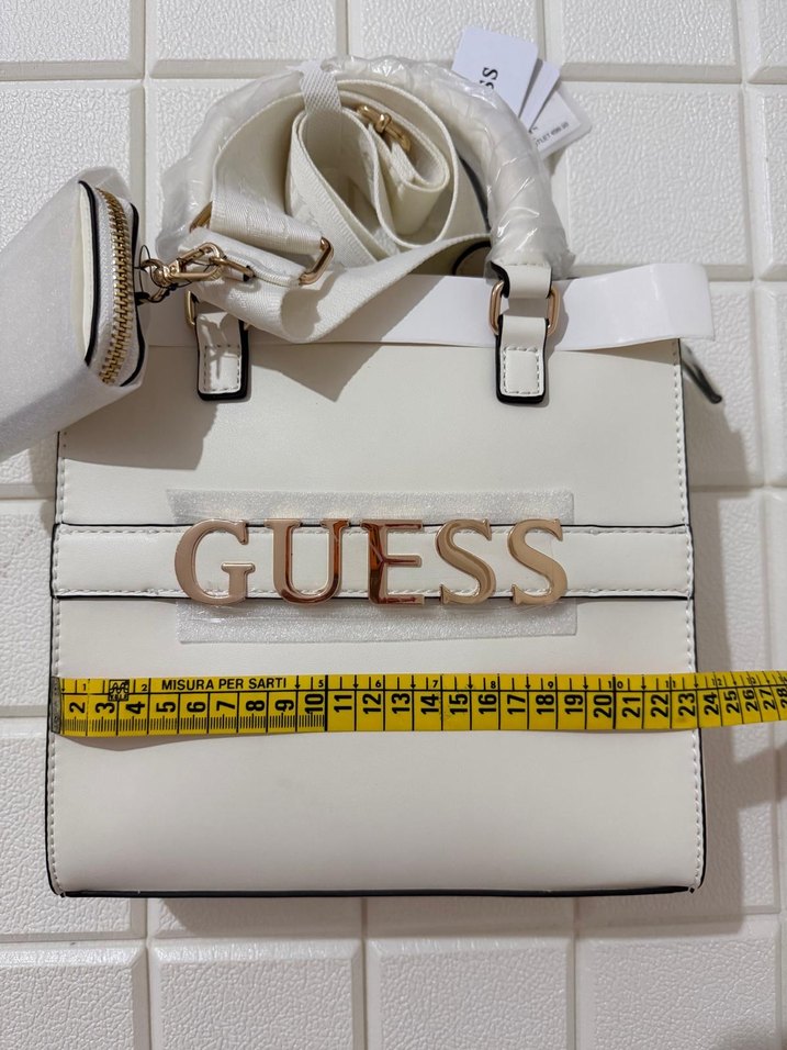Beyaz renkli, kemerli ve baskılı desene sahip Guess kadın omuz çantası. Sentetik kumaştan üretilmiş, sokak modası ve Paris tarzına uygun günlük kullanım için ideal.