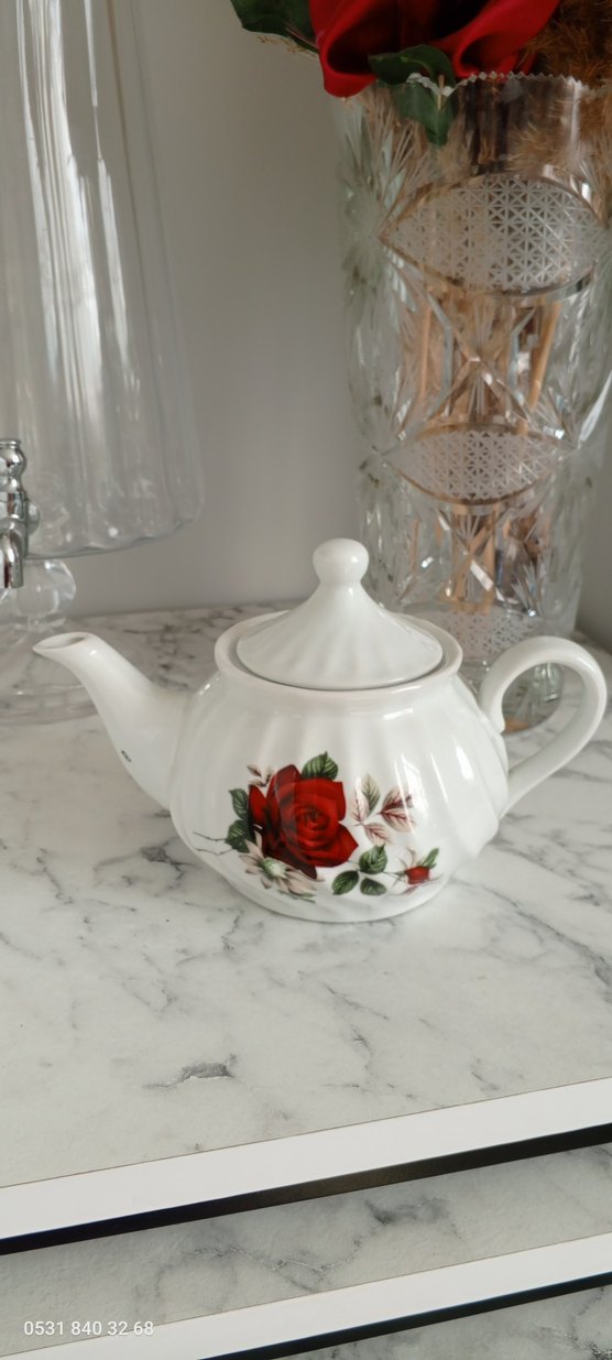 Renkli kırmızı gül desenli beyaz seramik demlik, yuvarlak şekilli ve kapaklıdır. Çay demlemek için uygundur.