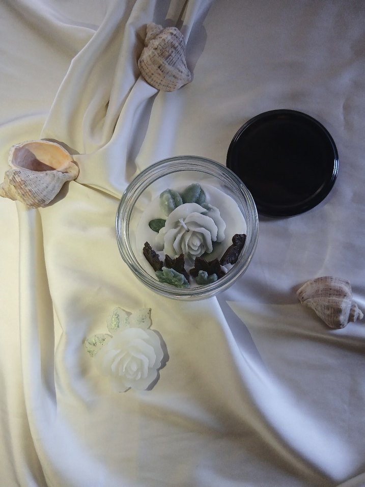 Cam kavanoz içinde siyah kapaklı, doğal detaylarla süslenmiş beyaz gül şeklinde mum. Dekoratif kullanım için uygundur.