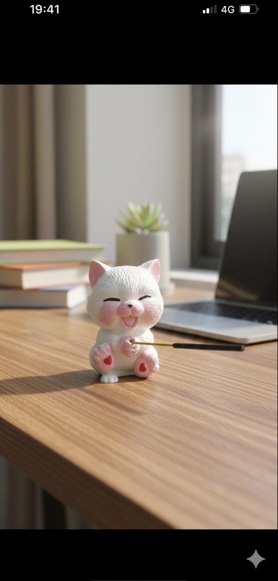 Pastel beyaz renkte, gülümseyen yüz ve kapalı gözlere sahip kedi figürin. Yanakları ve pati tabanları pembe tonlarında, sevimli bir detay katıyor. Çubuk tütsüsü için uygun