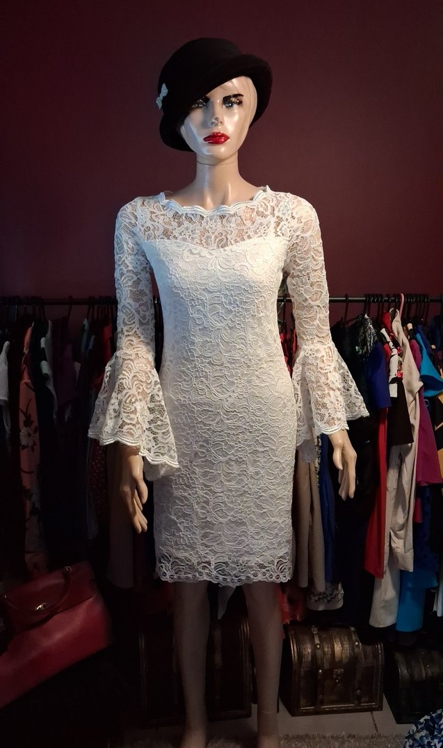 Beyaz güpür kendinden göğüs pedli abiye elbise kolları valonlu