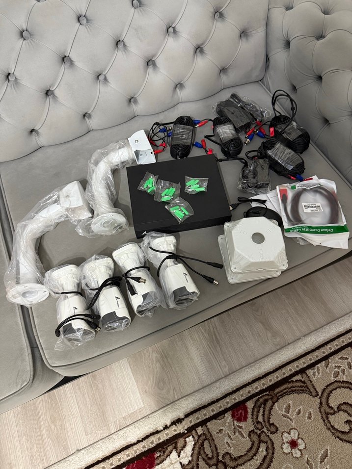 Dört beyaz güvenlik kamera, montaj aparatları, adaptörler, kontrol ünitesi ve kurulum aksesuarlarından oluşan set.