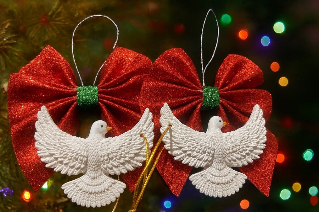 Detaylı kanatlı beyaz güvercinler, simli kırmızı fiyonklara bağlı yılbaşı süsü olarak kullanılır. Altın detay veya beyaz tercih edebilirsiniz. 2 fiyonk ve 2 güvercin