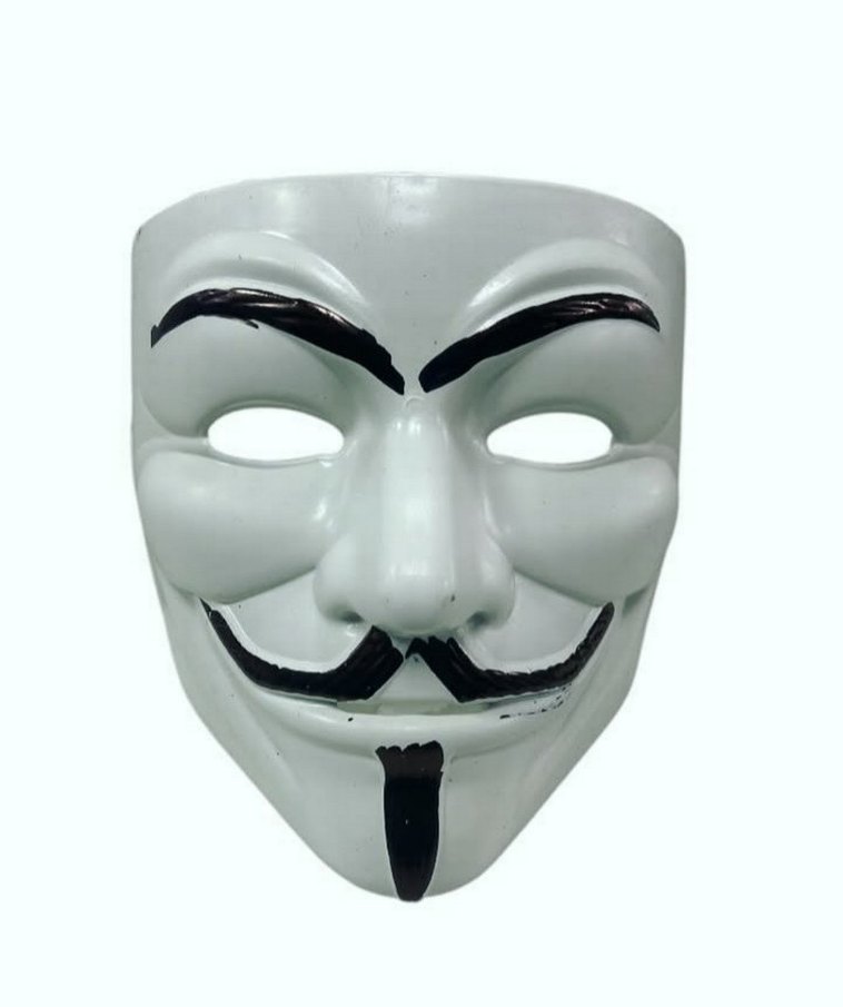 Kaş, bıyık ve sakal detayları siyah olan beyaz Guy Fawkes maskesi. Göz delikleri ve sağlam yapıya sahip.