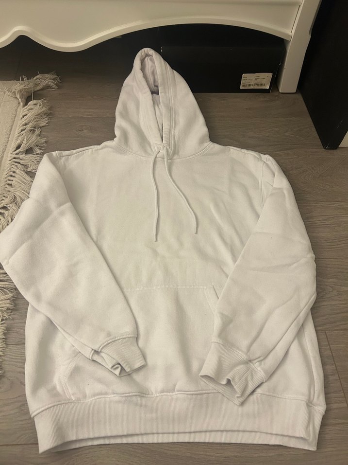 kapüşonlu ve uzun kollu, rahat kesim beyaz sweatshirt. Yumuşak ve sıcak kumaştan üretilmiş, sade tasarımlı ve normal boyda, günlük ve sokak stili için uygundur. H&M erkek reyonundan almıştım çok hafif tüylenmesi mevcut
