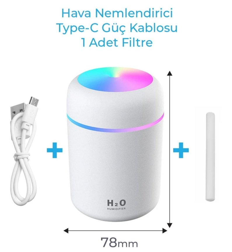 78mm çapında beyaz H2O hava nemlendirici, Type-C güç kablosu ve 1 adet filtre ile birlikte gelir. Renkli ışık özelliğine sahiptir.