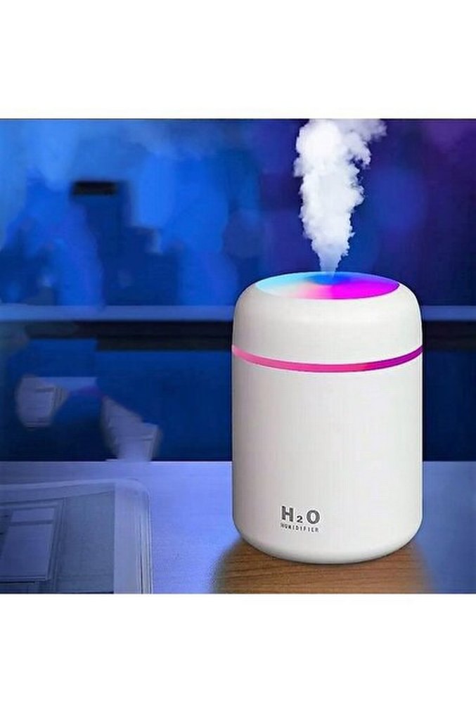 Beyaz H2O hava temizleyici ve nemlendirici, üstte yumuşak renkli ışıkla buhar yayar, odadaki hava kalitesini ve nem seviyesini artırır.