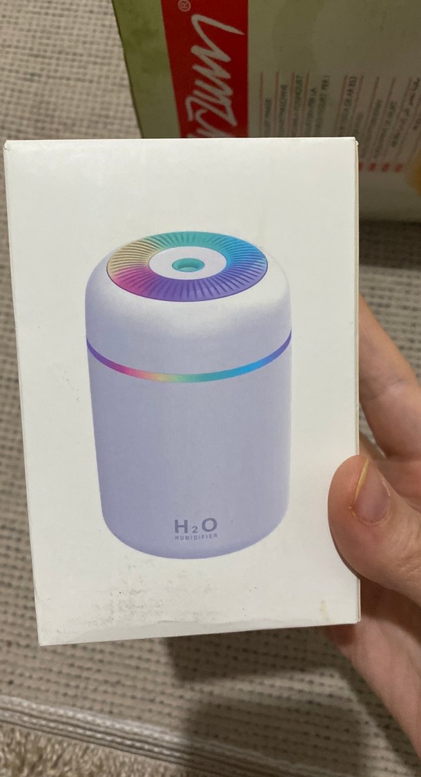 Üstünde renkli LED halkası olan beyaz H2O nemlendirici. Havanın nemini artırmak için kompakt tasarım. Hiç kullanılmadı