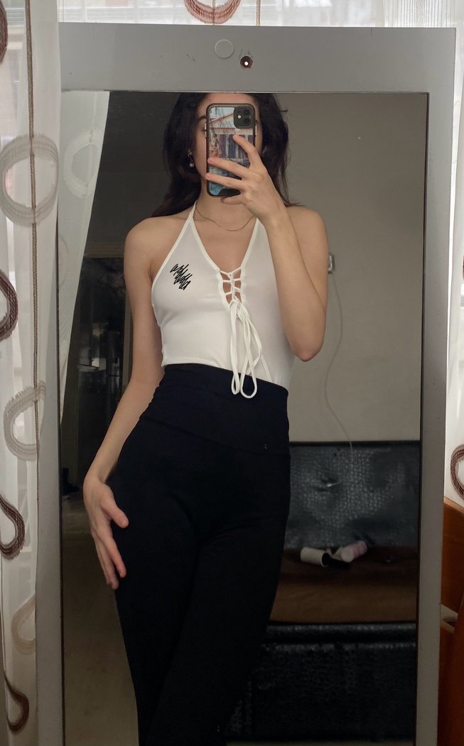 Beyaz, halter yaka ve ince askılı, normal midi boyda, satenimsi dokuda crop top. Günlük kullanıma uygun, sade ve şık tasarım. ✨Biraz iç belli ediyor doğru iç çamaşırı gerek