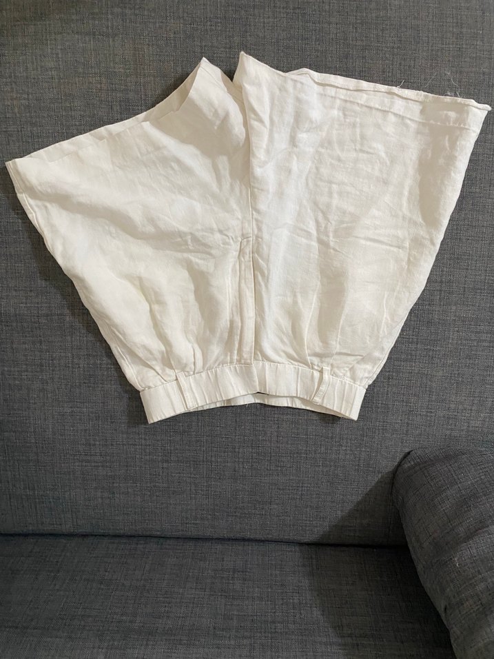 Beyaz keten hamile şortu, bol kesim ve mini boyda, günlük kullanım için rahat ve minimalist tarzda.