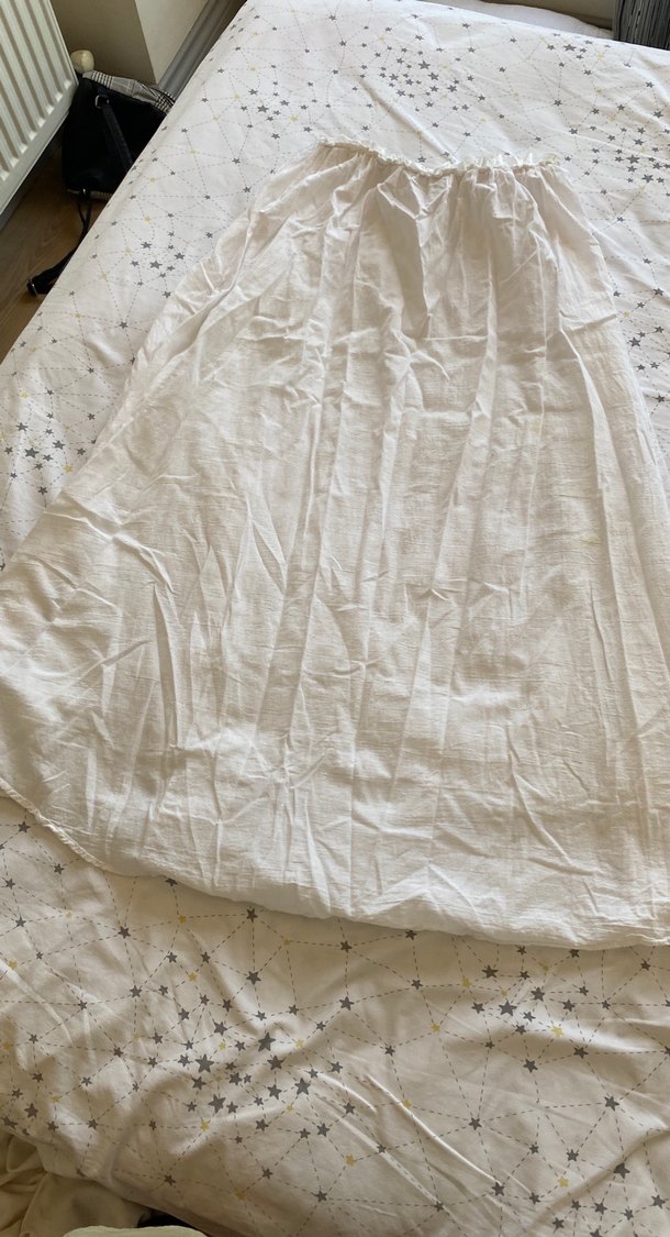 Beyaz keten hamile eteği, bol kesim ve drapeli tasarımı ile minimalist bohem tarzını yansıtır, parlak ve uzun yapısıyla düğünlere uygundur. M,l beden