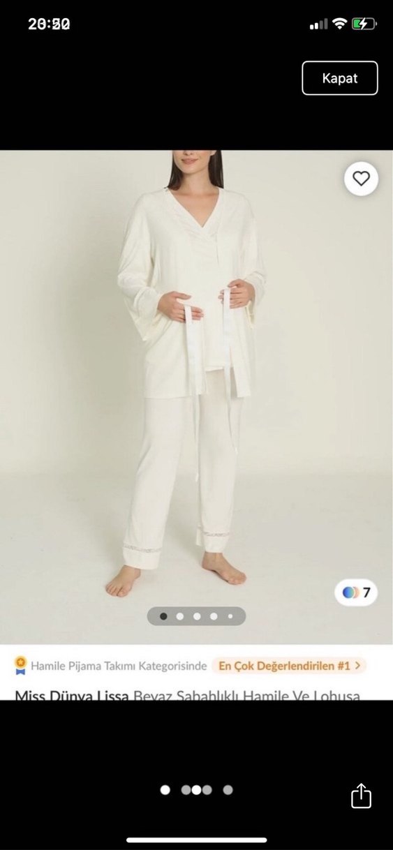 Beyaz renkte, bol kesim ve yakalı uzun kollu hamile ve lohusa pijama takımıdır. Midi boyda, desen içermeyen ve hafif dokulu kumaştan üretilmiştir.