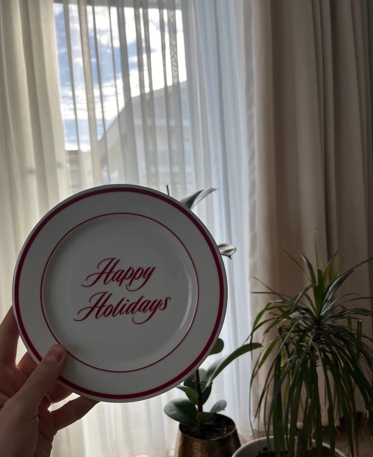 Ortasında 'Happy Holidays' yazısı bulunan kırmızı bordürlü beyaz tabak. Festivaller için uygun. ️