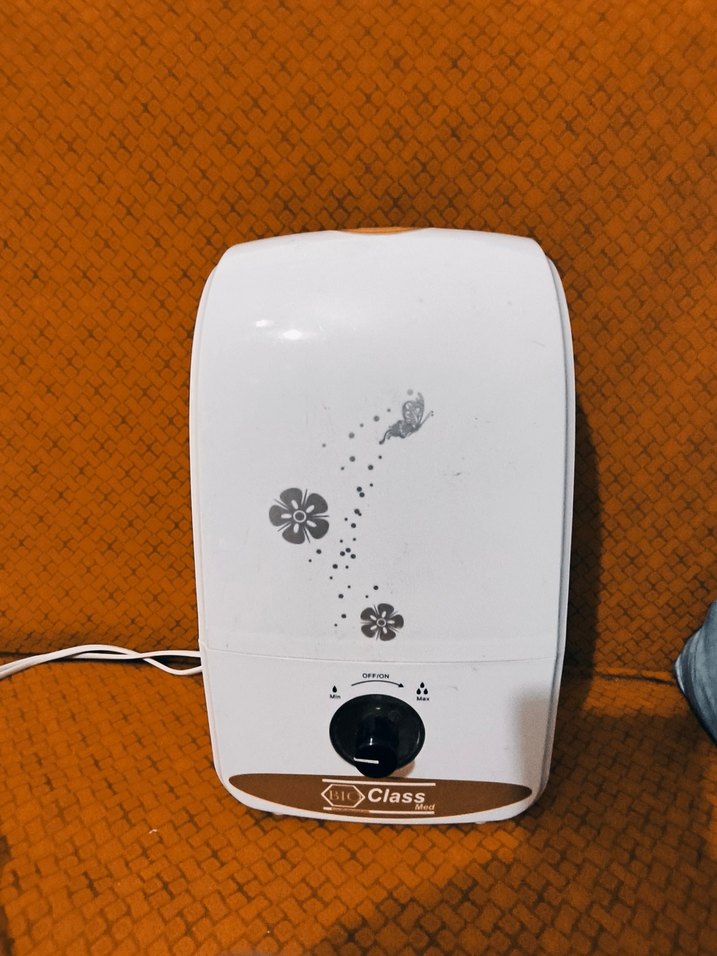 Çiçek desenli beyaz hava temizleyici ve nemlendirici, ayarlanabilir kontrol düğmesi ile kompakt ve kullanışlıdır.
