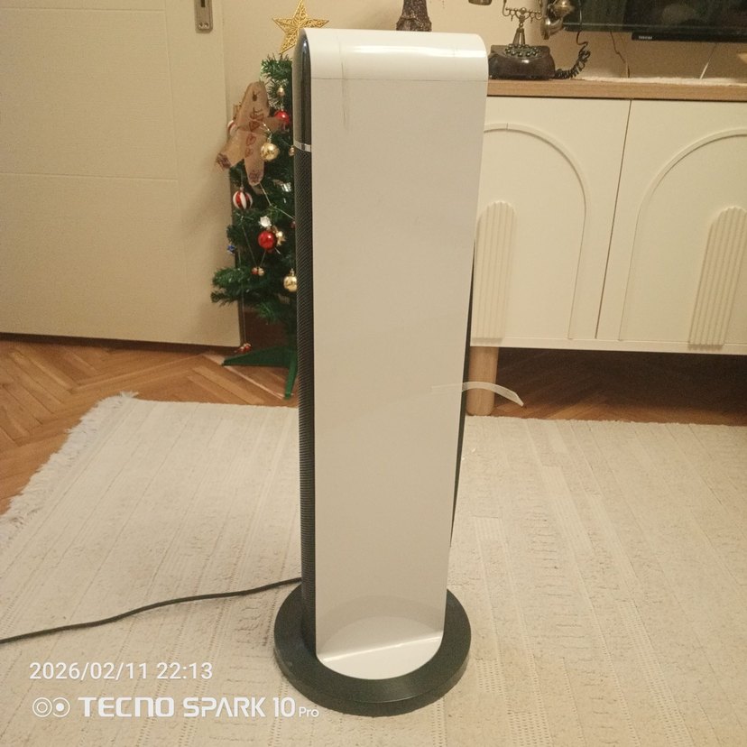 Beyaz renkli, koyu tabanlı dikey tasarıma sahip hava temizleyici ve nemlendirici, iç mekan hava kalitesini ve nem oranını artırır. ️