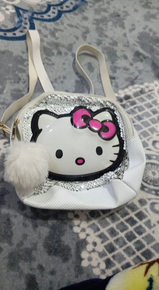 Beyaz renkli, renkli Hello Kitty baskılı bebek çantası. Üzerinde tüylü ponpon aksesuarı ve ayarlanabilir askılar bulunur.