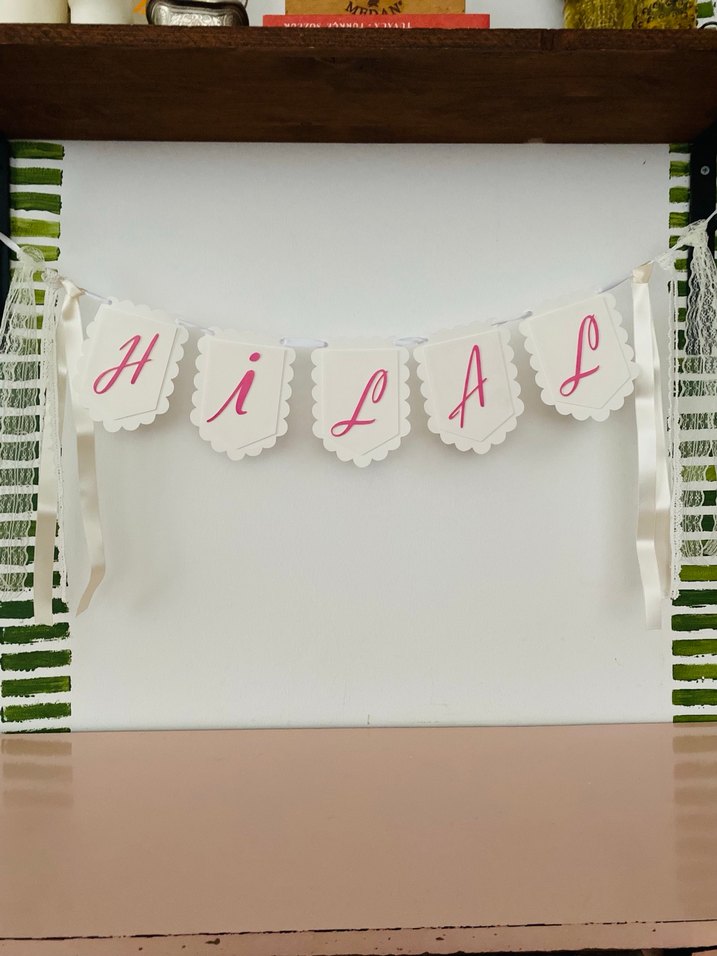 Pembe harflerle "HİLAL" yazılı beyaz panellerden oluşan dekoratif doğum günü duvar süsü, kurdelelerle bir araya getirilmiştir. Partiye hoş bir dokunuş katar.