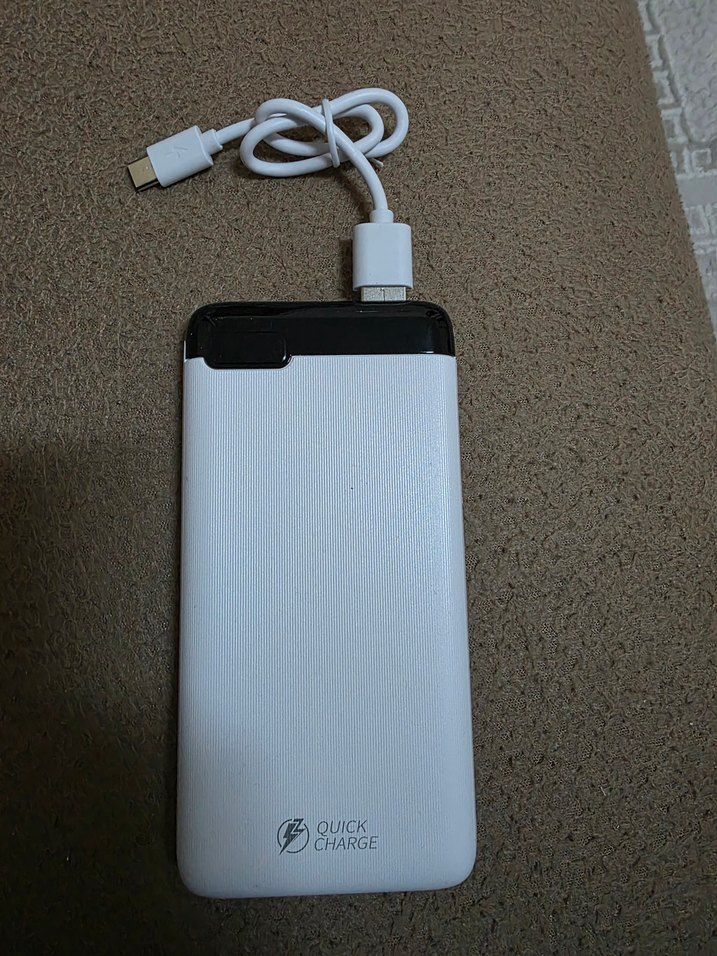 Hızlı şarj özelliğine sahip beyaz power bank. Kompakt tasarım ve USB kablo ile birlikte gelir. ⚡