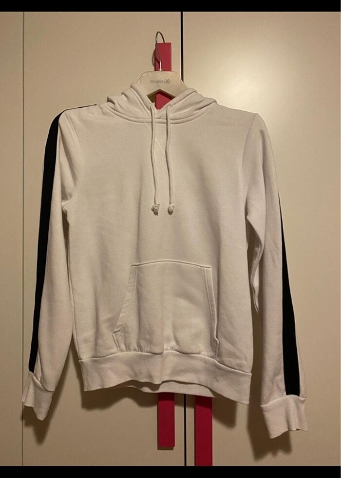 Ürün kapşonlu ve ceplidir. Kollarından omuzlarına kadar uzanan siyah şerit detayı var. İçi fotoğrafta da göründüğü gibi pamuklu ve çok sıcak tutuyor. Oldukça iyi durumdadır. Alan kişi çok severek kullanabilir eminim ki. Hafif oversize. Çok bol durmuyor.