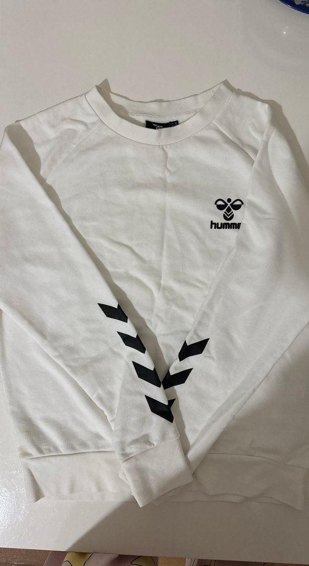 Beyaz Hummel sweatshirt, uzun kollu ve yuvarlak yakalıdır. Pamuklu kumaştan yapılmış olup, kollarda baskılı siyah şeritler ve logo detayları vardır. Rahat ve günlük kullanıma uygundur.