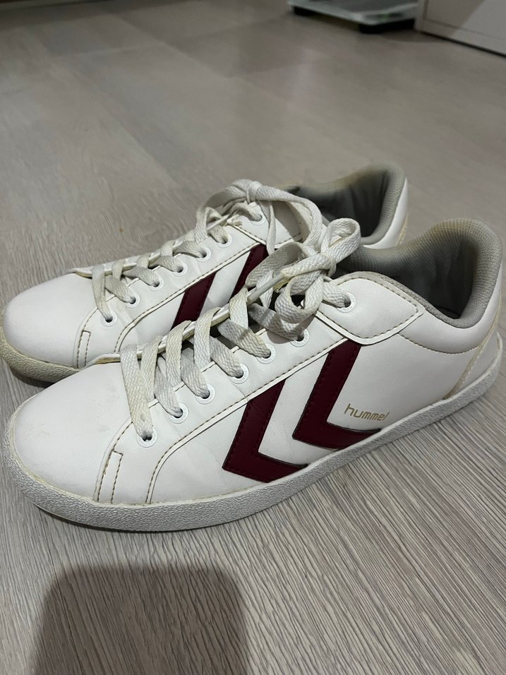 Beyaz Hummel kadın sneaker, bağcıklı ve baskılı desenli. Gri ve bordo detayları, kauçuk tabanlı ve ince topuklu, günlük şık kullanım için uygun.