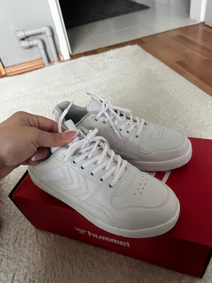 Beyaz Hummel kadın spor ayakkabısı, stiletto topuk ve cırt cırtlı detaylıdır. Kauçuk tabanlı, spor ve sokak stili için uygundur. Sadece 1 kez giyildi