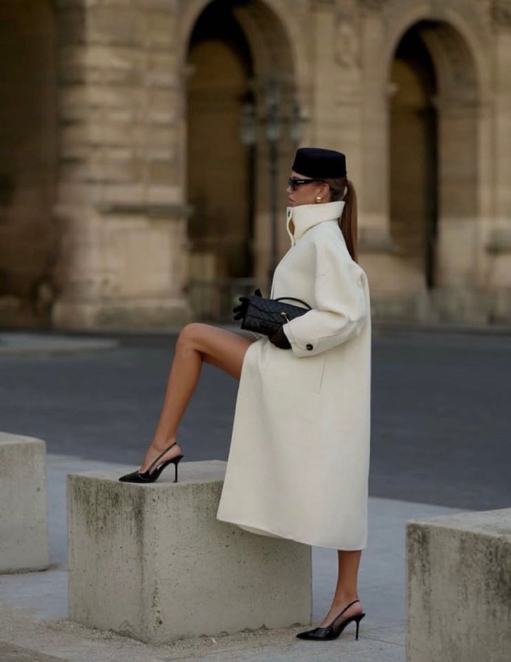 Yüksek yakalı, drapeli tasarıma sahip beyaz uzun kaban. İnce kesimi ve askılı kollarıyla günlük kullanıma uygun klasik ve şık bir parça.
