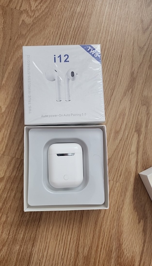 Beyaz i12 kablosuz Bluetooth kulaklık, otomatik açılma ve eşleştirme özellikleri ile Bluetooth 5.0 teknolojisine sahip, kompakt şarj kutusuyla birlikte.