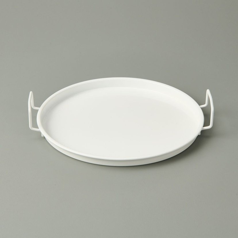 Düz yüzeyli ve kolay taşınabilen kenarları olan beyaz yuvarlak, modern tasarımlı tepsi. Servis veya düzenleme için uygundur. ️